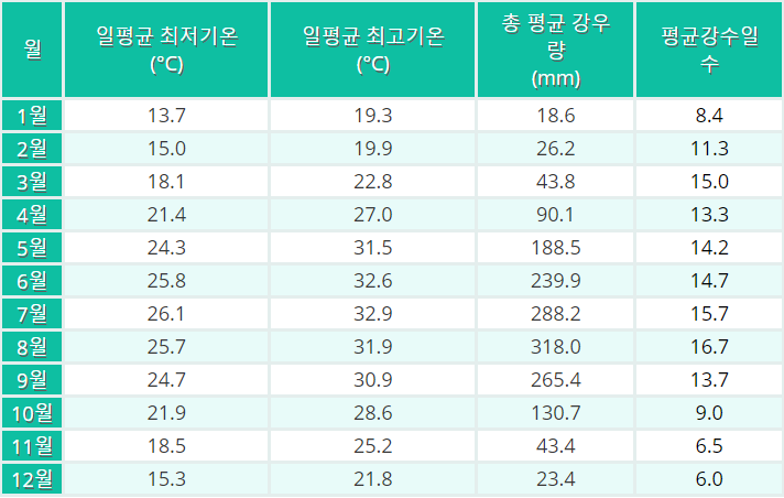 서울의 초여름 기온과 비슷하므로 여름철 옷가지를 준비하시면 됩니다. 한 달 중 열흘 이상 비가 내리므로 우산을 가져가시길 바랍니다.