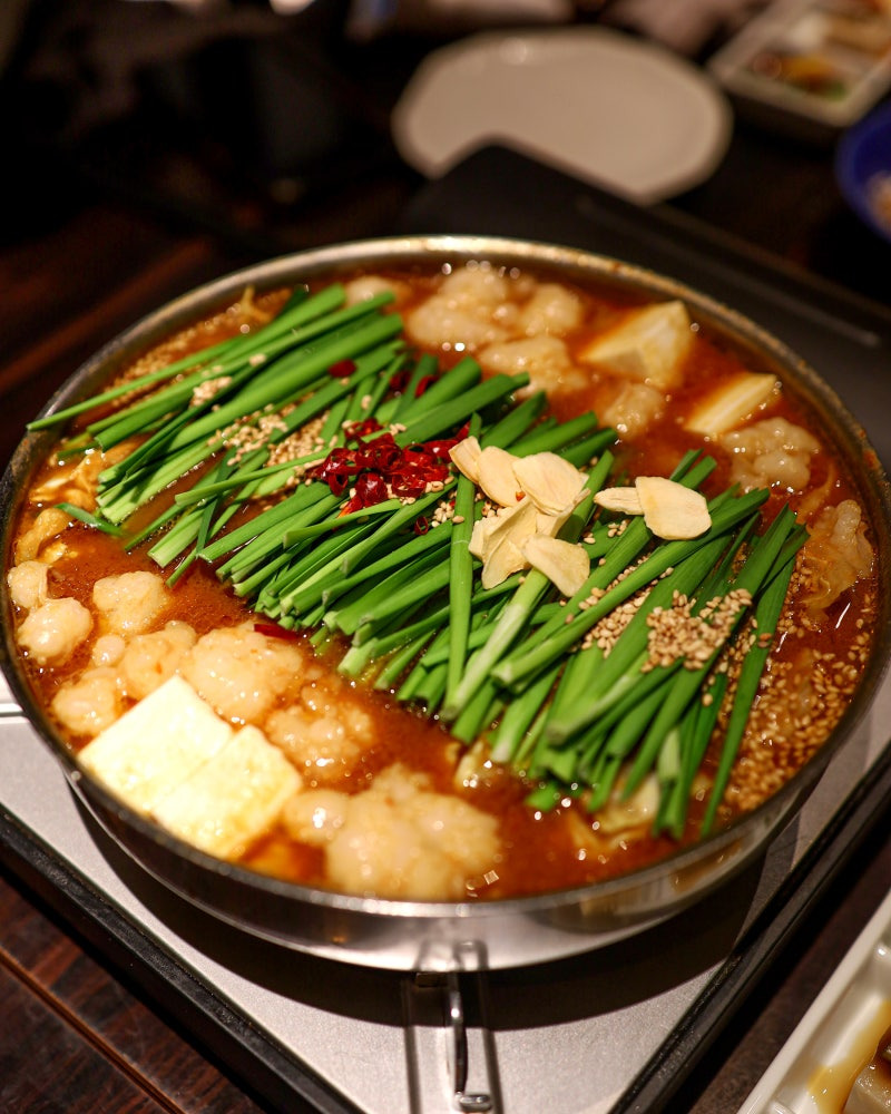 한국에서는 곱창을 주로 구워 먹지만, 후쿠오카에서는 전골로 끓여 먹는 게 정통이에요. 신선한 곱창과 대창을 깨끗하게 손질해서 잡내가 전혀 없고, 오히려 쫄깃하고 고소한 맛이 일품이랍니다!