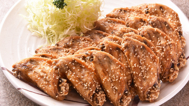 테바사키(手羽先, てばさき)는 닭날개를 튀겨 특제 소스를 바르고 참깨와 후추를 뿌린 나고야의 대표 술안주입니다.