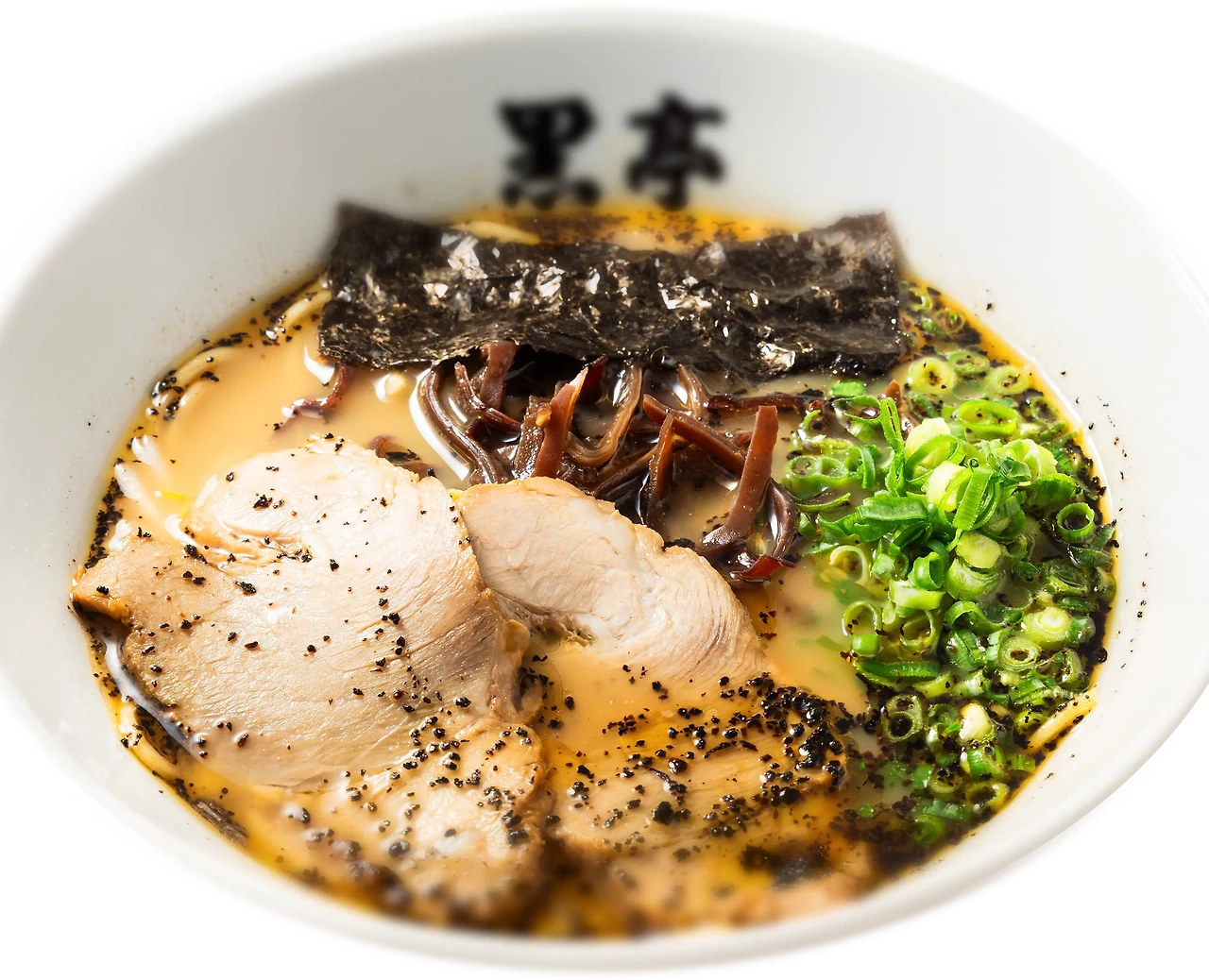 코무라사키의 가장 큰 특징은 깔끔함입니다. 돼지뼈를 베이스로 하면서도 아크(떫은맛)와 여분의 기름을 철저하게 제거하여 진하면서도 헬시한 스프를 만들어냅니다. 덕분에 돼지뼈 특유의 잡내가 거의 없어 폭넓은 세대에게 사랑받습니다. 마늘은 튀긴 것과 구운 것 2종류를 사용하는데, 마늘의 진한 풍미가 겹겹이 쌓인 스프와 어우러져 한 입 한 입 먹을 때마다 절묘한 조화를 이룹니다.