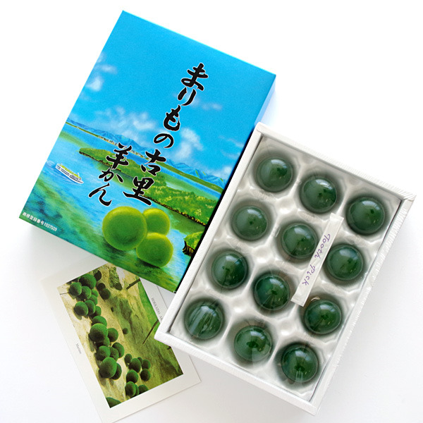 홋카이도의 유명 제과 브랜드 롯카테이(六花亭)에서 만든 마리모요칸은 귀여운 비주얼로 인기가 많은 양갱이에요. 둥근 풍선처럼 생긴 투명 용기 안에 초록색 양갱이 들어있는데, 이게 홋카이도 아칸호수의 천연기념물인 마리모를 형상화한 거예요.