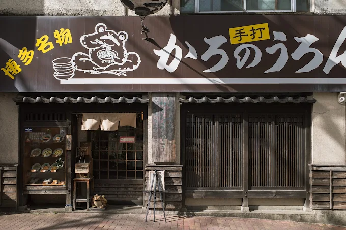 1882년 창업한 후쿠오카에서 가장 오래된 우동집이에요. 무려 140년이 넘는 역사를 자랑하는 곳이죠. 가게 이름인 '카로노우롱'은 '카도노우동(모퉁이 우동)'을 후쿠오카 사투리로 발음한 거예요. 후쿠오카 현지인들이 후쿠오카 우동을 이야기할 때 가장 먼저 떠올리는 바로 그 집이에요.