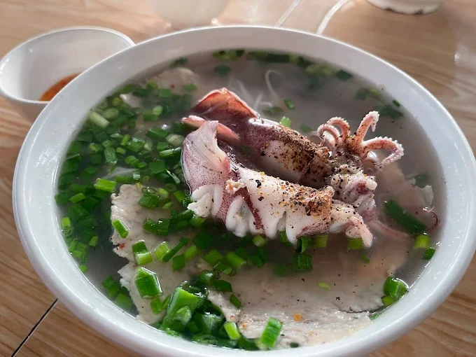 이곳에서는 푸꾸옥 특산 총알 오징어가 듬뿍 올라간 후띠유를 맛볼 수 있어요. 흔히 먹던 퍼와 달리 가늘고 쫄깃한 면발이 특징이고, 신선한 오징어의 식감이 일품이에요.