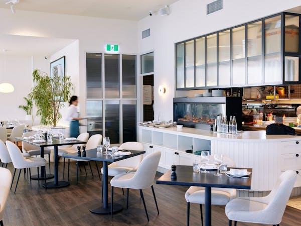 분위기: 우아한 스톤 팔레트, 플러시 시팅, 천장부터 바닥까지 드레이프 커튼이 있는 메인 레스토랑은 여름날의 글래머러스한 분위기를 자아냅니다. VJ 패널 벽, 커브드 부스, 크림색 의자와 블랙 테이블, 화분 식물들이 컨템포러리와 레트로를 절묘하게 조화시킵니다. 오픈 키친이 한쪽 벽을 따라 있고, 중앙에는 원형 타일 바가 있습니다. 퀸즐랜더 스타일 아치와 플로어 투 씰링 바이폴드로 분리된 바 공간은 리버 뷰를 감상하며 칵테일을 즐기기 완벽합니다. 넓은 알프레스코 다이닝 구역은 애완견 동반 가능합니다.