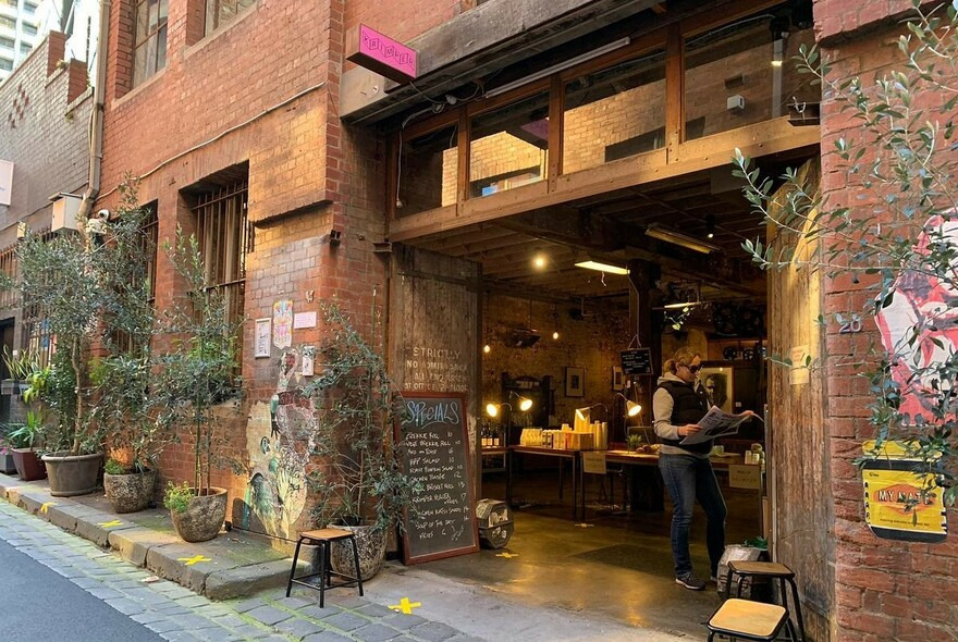 - 퀸 스트리트 바로 옆, 멜버른에서 가장 오래되고 귀여운 레인웨이 중 하나인 길드포드 레인에 위치 – 길드포드 레인은 약간의 경사와 몇몇 조약돌이 있지만 스텝-프리 입구