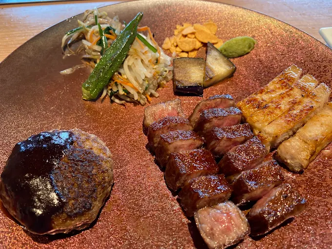 꼭 먹어봐야 할 메뉴는 미야코규 5종 모리아와세(宮古牛五種盛合せ)예요. 가격은 2,750엔인데, 그날그날 가장 상태가 좋은 5가지 부위를 한 접시에 담아주는 메뉴예요. 나카니쿠(중심부 살), 쿠리미, 사로인, 쿠라시타, 자부톤 등 고급 부위들이 아름다운 마블링을 자랑하며 나온답니다. 사시는 너무 곱고 아름다워서 먹기 전에 사진부터 찍게 돼요.