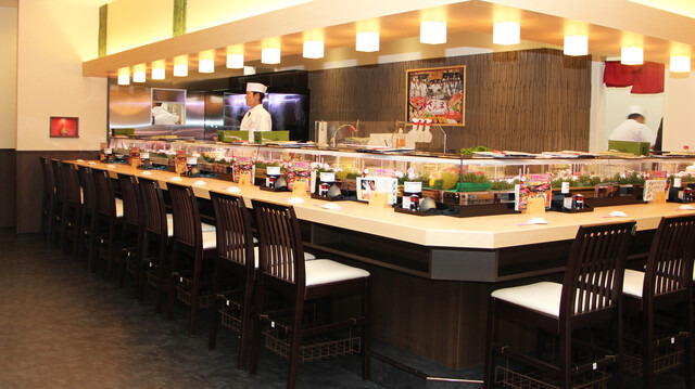 건물과 인테리어 신주쿠 가부키초 메인 스트리트에 위치한 대형 매장으로, 빌딩 전체가 스시잔마이입니다. 1층과 2층으로 나뉘어 있으며, 총 84석 규모의 넓은 공간입니다.