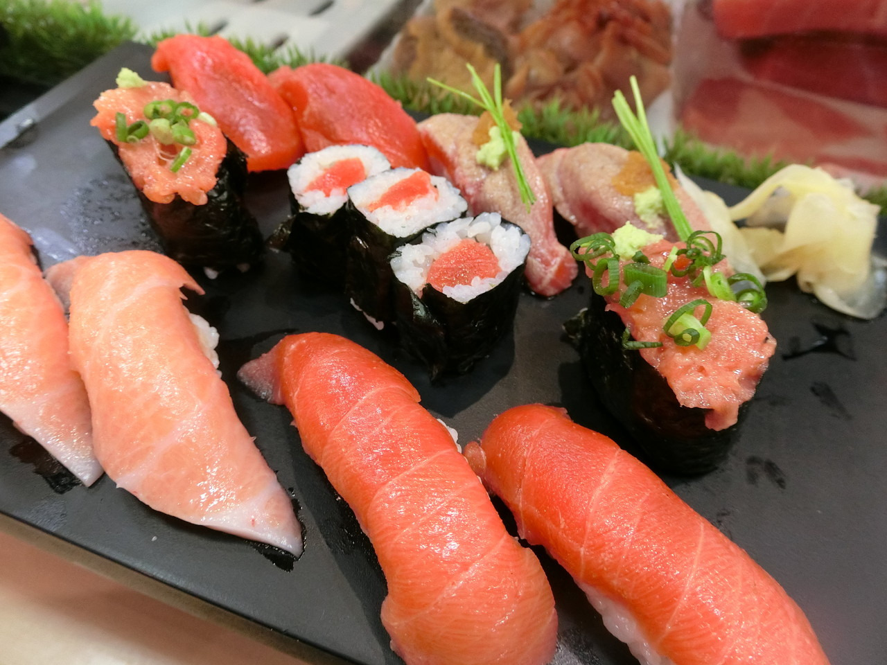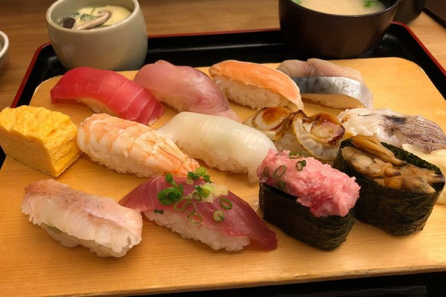 스시 87종 참치(오토로, 주토로, 아카미), 연어, 광어, 도미, 성게, 연어알, 새우, 문어, 오징어, 장어, 고등어, 전갱이, 가리비 등 상상할 수 있는 거의 모든 스시가 있습니다.