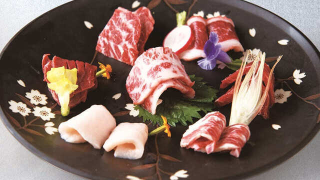 말고기는 벚꽃 색깔처럼 아름다운 분홍빛을 띤다 하여 사쿠라니쿠(桜肉)라고도 불리며, 저지방 고단백에 철분이 풍부한 건강식품으로도 각광받고 있습니다. 특히 말고기 회인 바사시(馬刺し)는 구마모토를 대표하는 향토 요리로, 적신(赤身), 코우네(たてがみ, 갈기), 후타에고(二重子, 갈비), 레바(레버) 등 다양한 부위를 즐길 수 있습니다. 구마모토의 이자카야에서는 이러한 말고기 요리는 물론, 카라시 렌콘(겨자를 채운 연근 튀김), 이치몬지노 구루구루(파를 돌돌 말아 된장 소스에 찍어 먹는 요리) 같은 독특한 향토 요리도 함께 맛볼 수 있습니다.