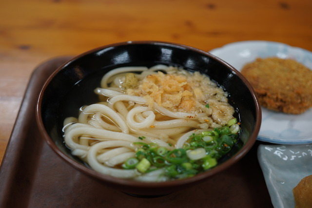셀프 방식이라 직접 우동을 데우고 파, 생강, 튀김가루, 미역 등 토핑을 올려야 하는데, 이 과정도 재미있는 경험입니다. 우동의 양은 타마 단위로 주문하며, 1타마가 170엔으로 매우 저렴합니다. 튀김을 함께 먹기 때문에 1타마나 1.5타마 정도가 적당합니다.