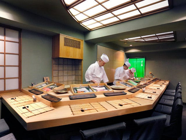 후쿠오카의 나가하마 시장을 비롯해 전국 각지에서 공수한 제철 생선으로 만든 정통 에도마에 스시를 맛볼 수 있는 곳이에요. 넓은 카운터석에서 장인의 손놀림을 감상하며 스시를 즐기는 특별한 경험을 할 수 있답니다!